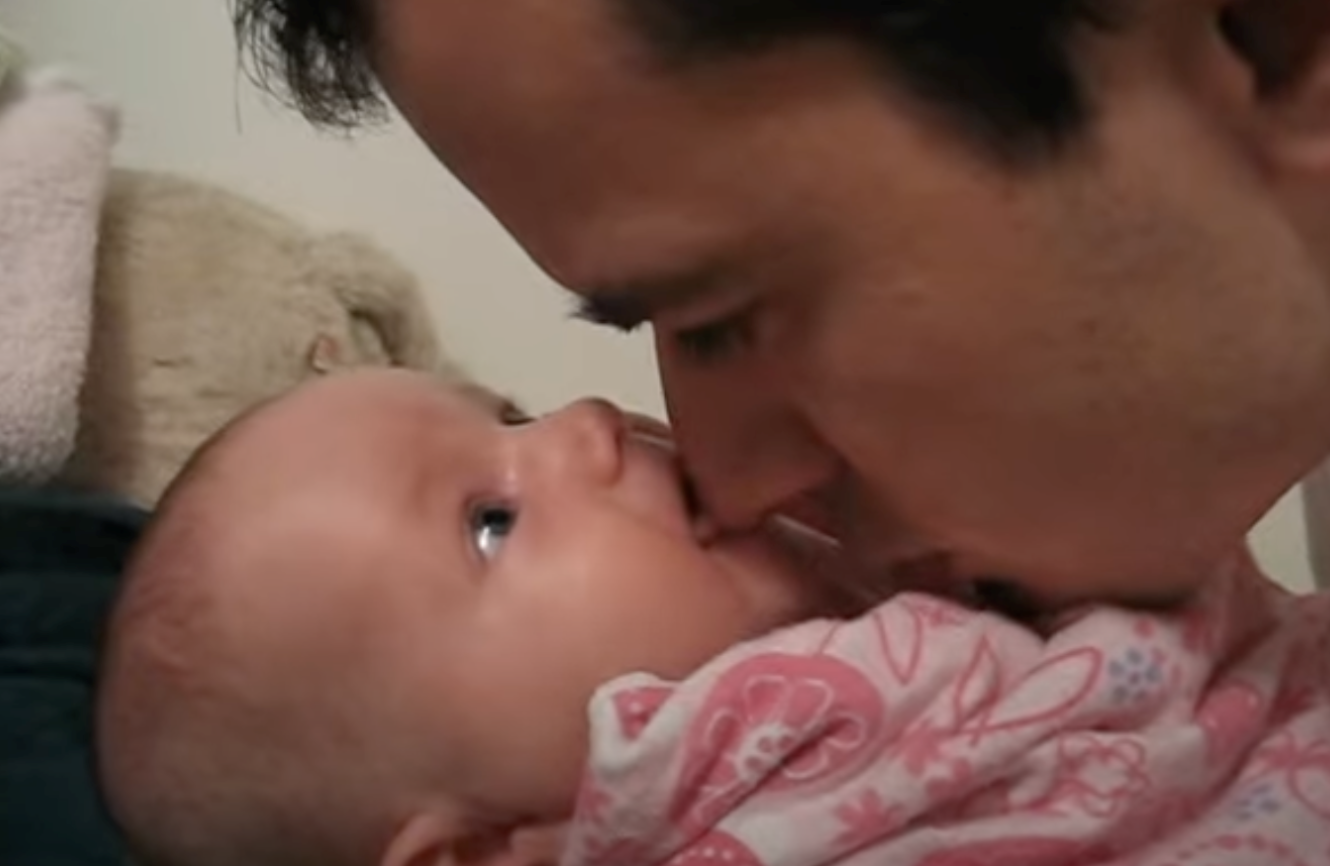 очима і міцно стиснутою крихітною ручкою, вона ніжно покусує ніс свого батька,